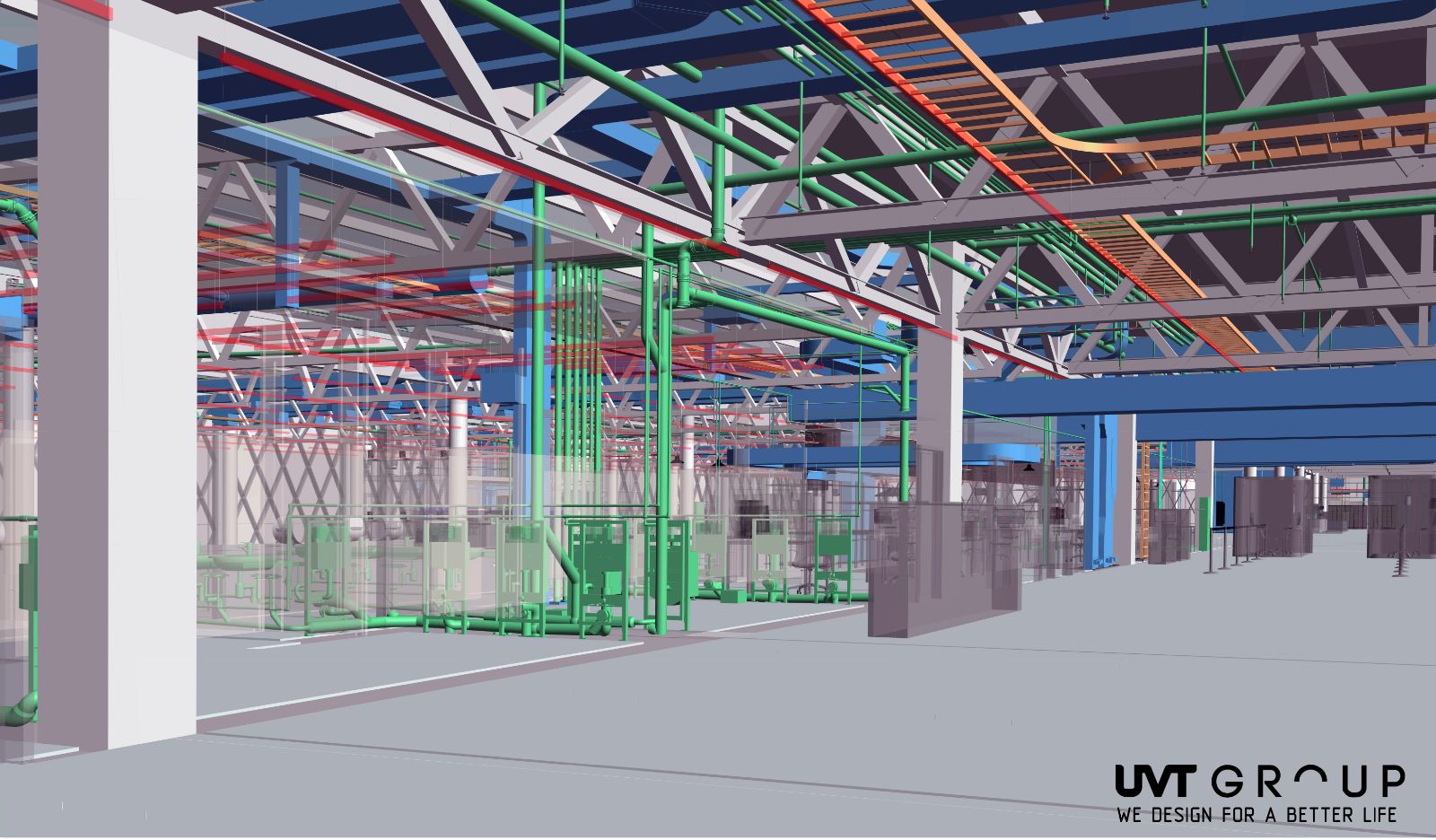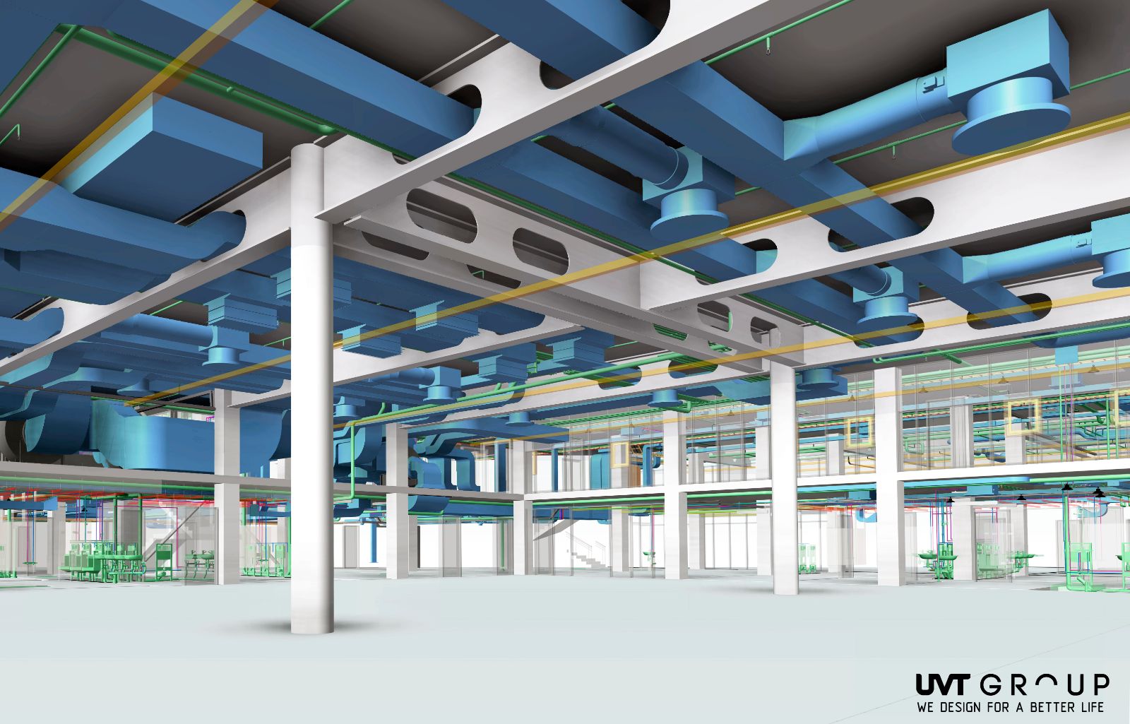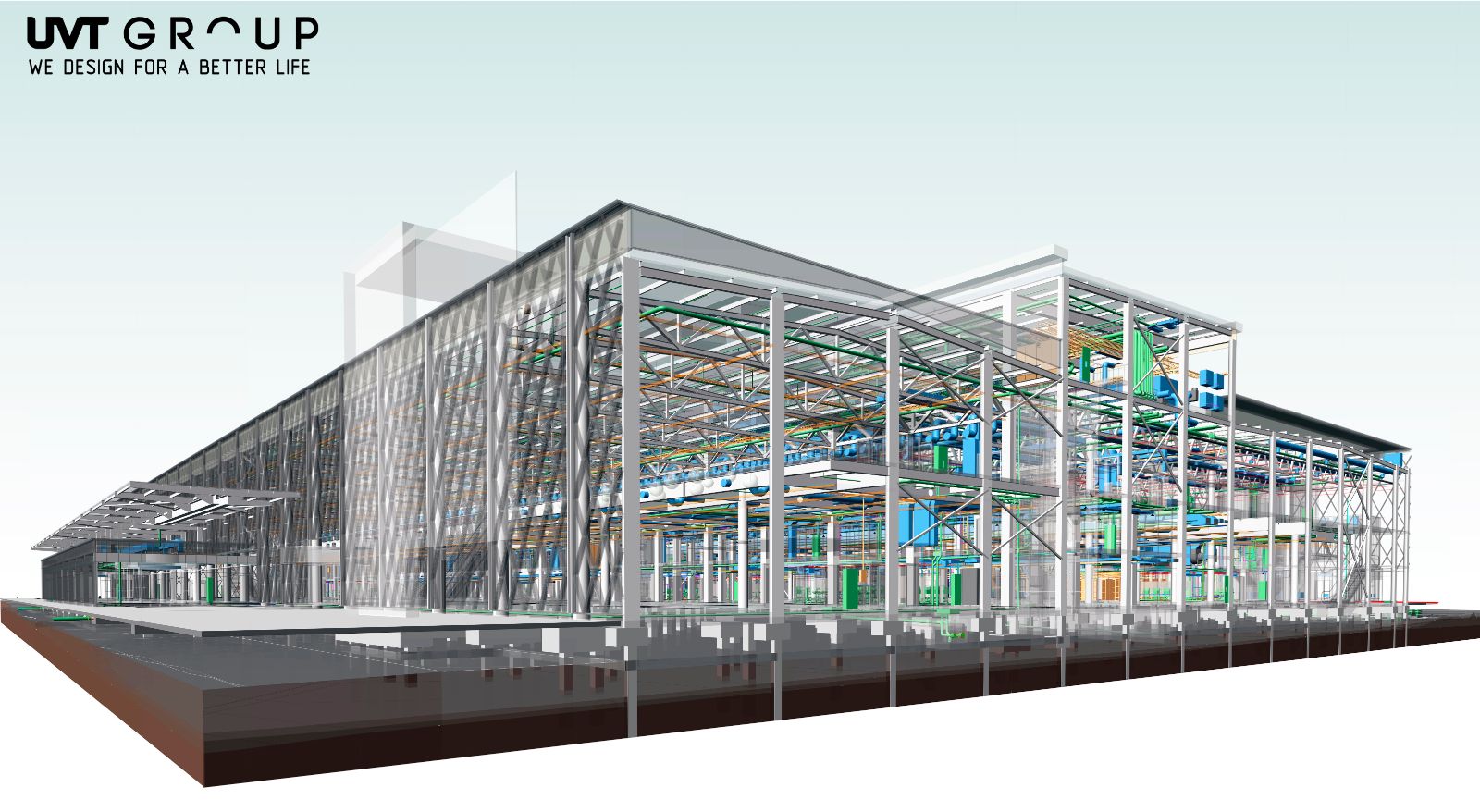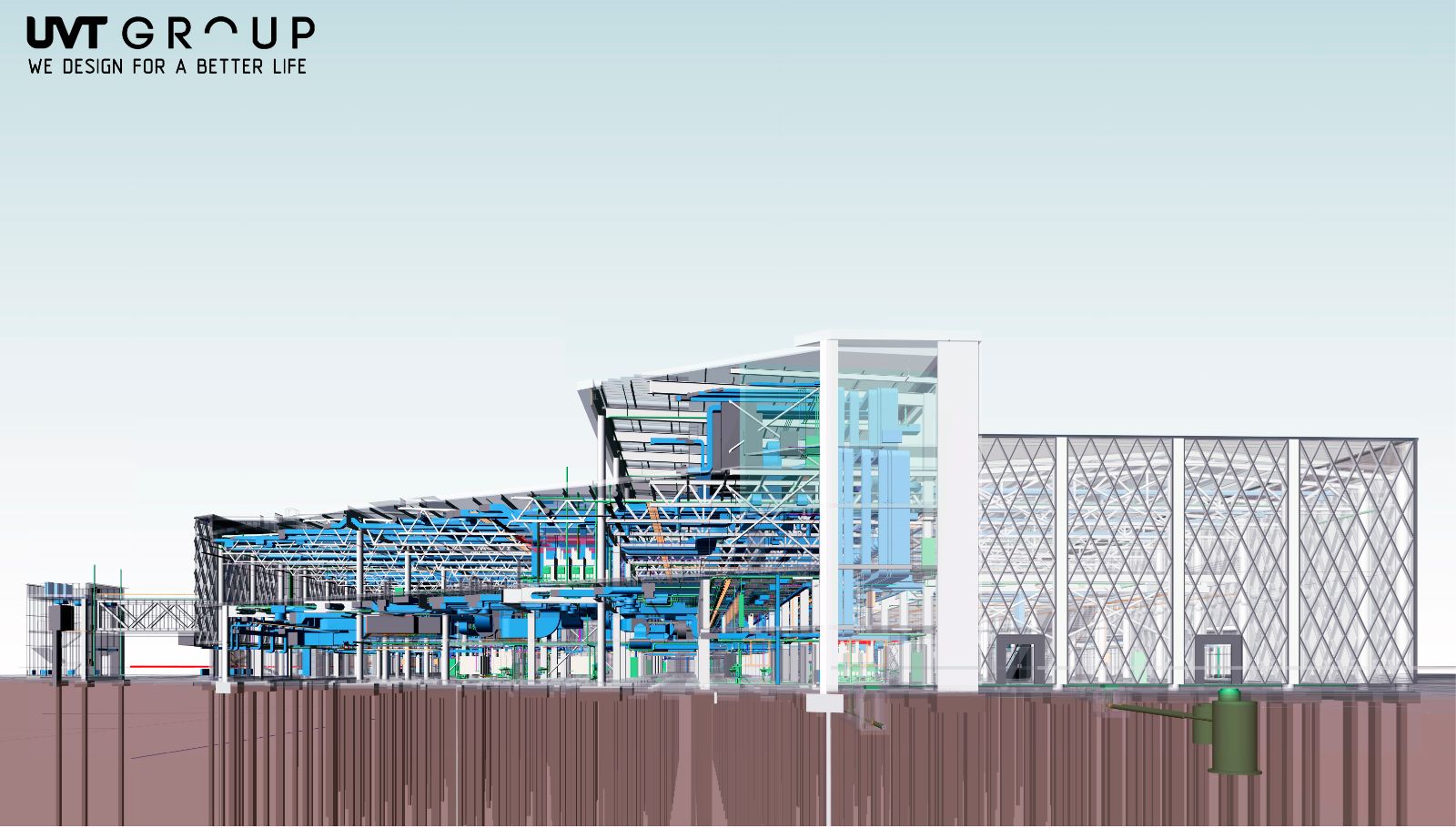 Компания UVT GROUP успешно использует потенциал BIM менеджмента, имеет собственный стандарт выполнения работ. Платформой для выполнения работ является программный продукт Revit от компании Autodesk в котором выполняются все без исключения разделы проекта, включая генеральный план и внутриплощадочные сети. Инструменты виртуальной реальности помогают отслеживать ошибки сечения с одновременным рендерингом с основной BIM модели.