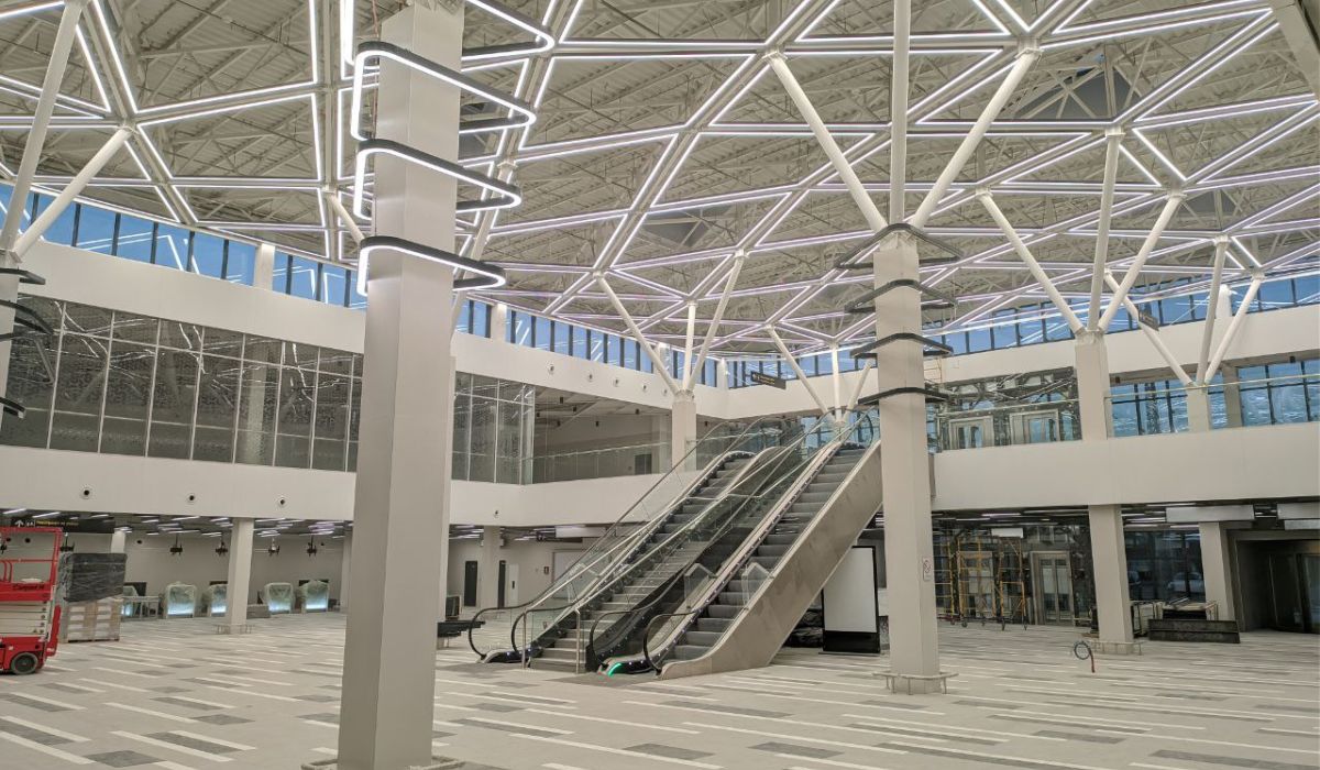 Багато суперечок було, що до вигляду стелі в головному холі терміналу. Наразі реалізований розроблений компанією UVT GROUP варіант із довгими світильниками, які повторюють конфігурацію ферм стелі.